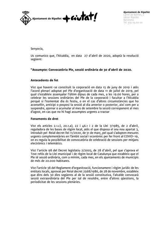 L'Ajuntament de Ripollet celebrarà aquest dijous, 30 d'abril, la sessió mensual del Ple ordinari, que tindrà lloc a les 12 del migdia, mitjançant el sistema de videoconferència. El Ple compta amb 15 punts a l'ordre del dia, entre ells el de l'aprovació de la liquidació del Pressupost 2019 i l'adhesió al Consorci Localret. El punt de mocions compta amb un text en recolzament de la llibertat d'elecció educativa, presentat pel grup municipal de C's.