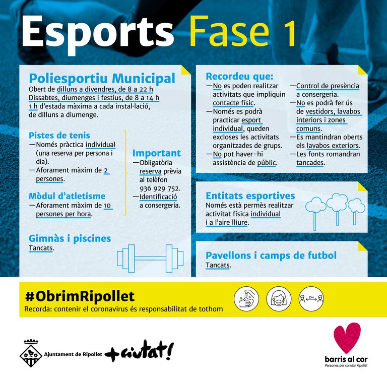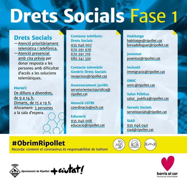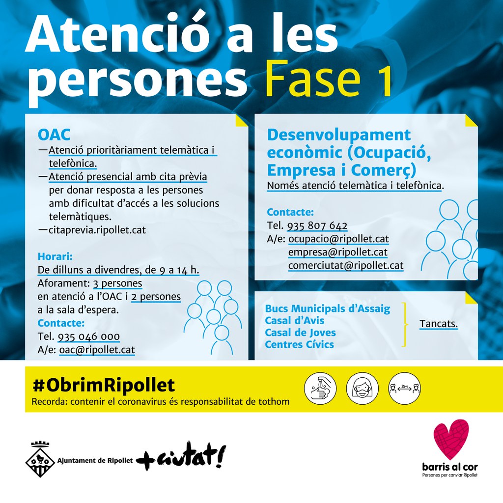 L'Ajuntament continua apel·lant a la responsabilitat social i a la prudència en aquesta nova fase i demana a la ciutadania, quant a la reobertura dels serveis municipals, que prioritzi l'accés per via telefònica i telemàtica. Amb l'etiqueta #ObrimRipollet, el consistori anirà informant fase a fase de les noves mesures de la desescalada a les xarxes socials i a la web municipal ripollet.cat (consulteu imatges adjuntes).
