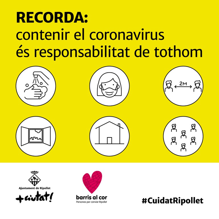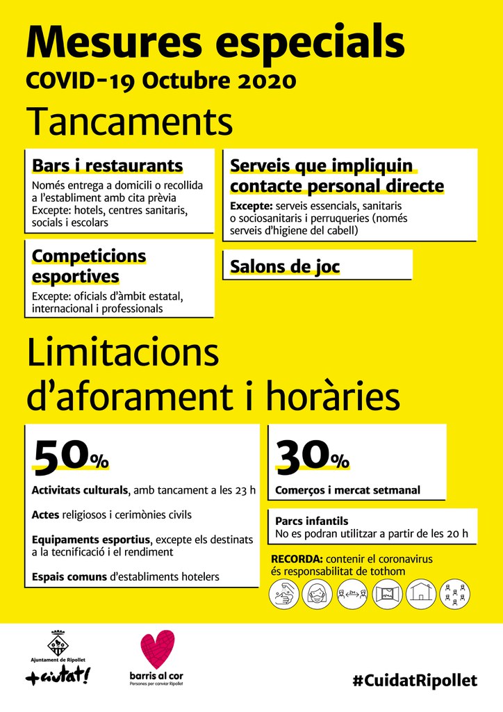 Les mesures que afecten la prohibició de trobades de sis persones, les classes universitàries via telemàtica i la reducció de l'aforament al 50% dels actes religiosos i les cerimònies civils ja han estat autoritzades pel TSJC. A banda de les restriccions, també es demana a la ciutadania que limiti els desplaçaments i redueixi les relacions socials, i es reclama a les empreses que prioritzin el teletreball. Des de l'Ajuntament de Ripollet, que els darrers dies ha iniciat la campanya #CuidatRipollet, s'insisteix en la responsabilitat compartida de tota la ciutadania per contenir el contagi de la Covid19, recordant la importància de mesures de prevenció bàsiques com el rentat de mans, l'ús de la mascareta, ventilar els espais tancat o mantenir grups estables de convivència, entre d'altres.