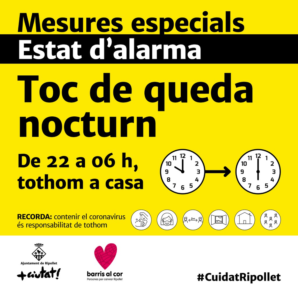 Després de la declaració de l'estat d'alarma aquest diumenge per part del govern espanyol, la Generalitat de Catalunya, en el marc del PROCICAT, ha adoptat mesures de salut pública, de restricció de la mobilitat nocturna, per a la contenció del brot epidèmic de la pandèmia de la COVID-19 a tot Catalunya. Es tracta, principalment, de l'entrada en vigor del toc de queda, entre les 22 h i les 6 h, així com l'afectació d'horaris d'obertura d'establiments, serveis i instal·lacions esportives i culturals.