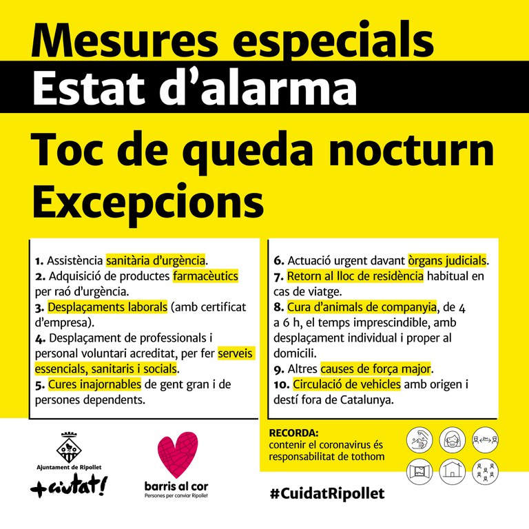 Quant al toc de queda, s'han establert algunes excepcions (consulteu a la imatge adjunta), per motius d'urgència; desplaçaments laborals; de professionals i personal voluntari per fer serveis essencials, sanitaris i socials, i altres causes de força major. Si és per cura d'animals de companyia, cal que sigui de 4 a 6 h i a prop del domicili.