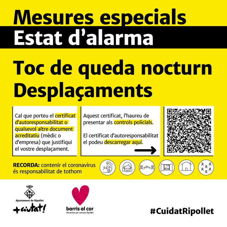 Durant el toc de queda nocturn, si s'han de fer desplaçaments, cal portar el certificat d'autoresponsabilitat o qualsevol altre document acreditatiu, mèdic o d'empresa, que el justifiqui. Aquest certificat l'haurà de presentar als controls policials i es pot obtenir en aquest enllaç.
