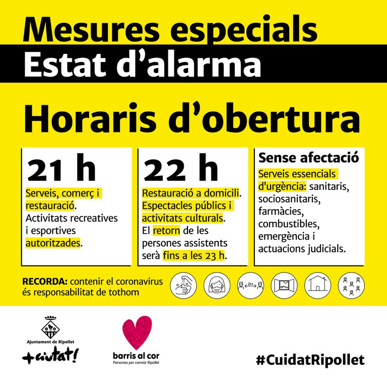 Les mesures especials per l'estat d'alarma també afecten els horaris d'obertura de comerços, serveis i restauració, què hauran de tancar a 21 h, així com les activitats recreatives i esportives autoritzades. Poden obrir fins a les 22 h els establiments de restauració a domicili, els espectacles públics i les activitats culturals. El retorn de les persones assistents serà fins a les 23 h. Resten sense afectació els serveis essencials d'urgència: sanitaris, sociosanitaris, farmàcies, combustibles, emergència i actuacions judicials.