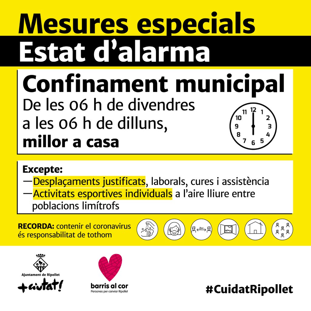 Com a mínim, fins al 9 de novembre, no es pot entrar ni sortir de Catalunya i durant els caps de setmana la restricció afecta al municipi, des de les 6 h de divendres fins a les 6 h de dilluns. També es manté el toc de queda, de 22 h a 6 del matí. Les excepcions han de ser justificades per motius sanitaris, laborals o per causa de força major i cal aportar un certificat autoresponsable de desplaçament o un document acreditatiu.