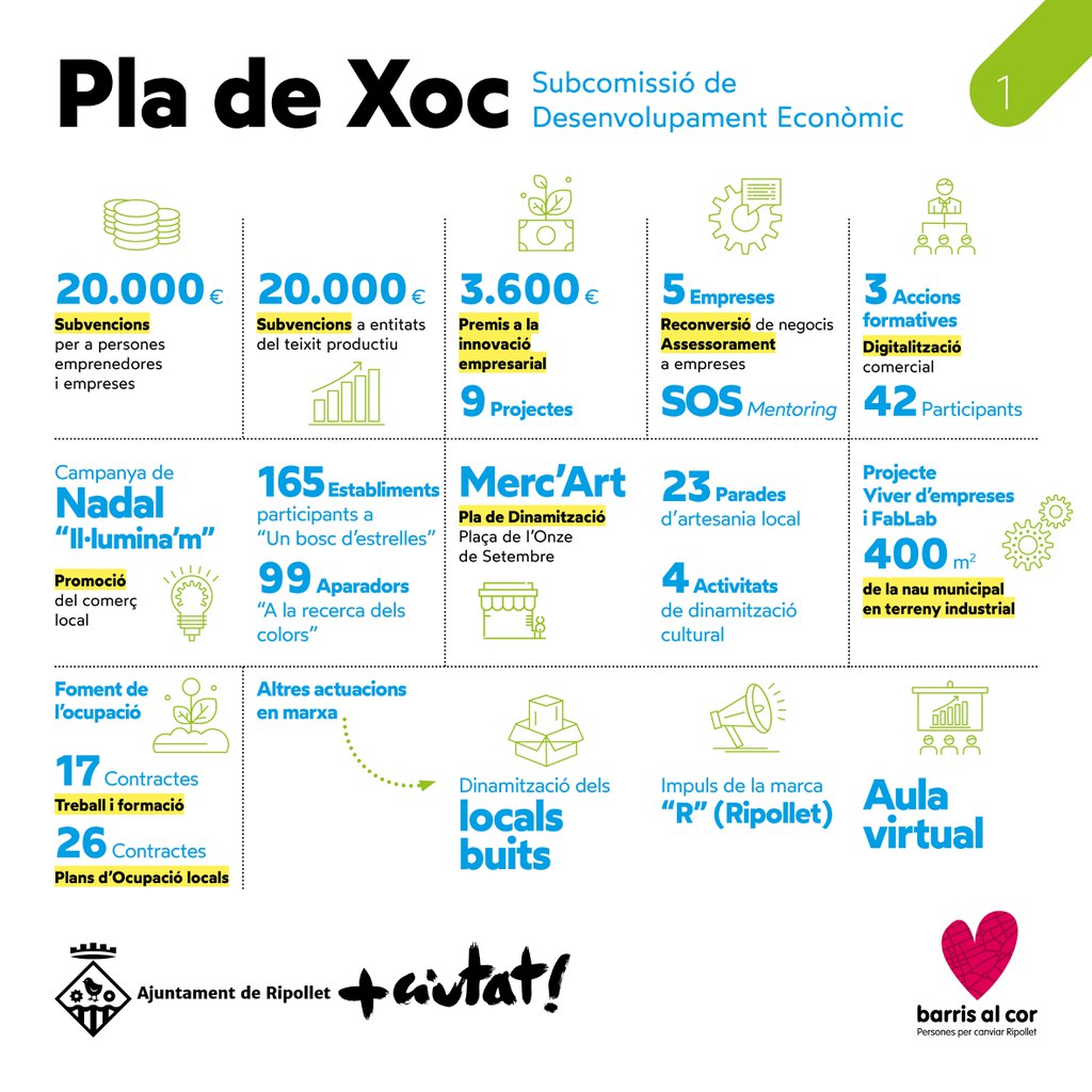 La situació sanitària que estem vivint des de fa prop d'un any ha provocat una greu crisi social i econòmica, que l'Ajuntament ha intentat pal·liar amb les 150 mesures que conformen el 'Pla de Xoc. Bases per a la reparació i recuperació social i econòmica de Ripollet', aprovat per unanimitat en un Ple extraordinari, el juliol de 2020. Es tracta de mesures consensuades en tres taules de treball amb representants de tots els grups municipals, del teixit associatiu i empresarial i tècnics municipals, la major part de les quals ja s'han dut a terme.