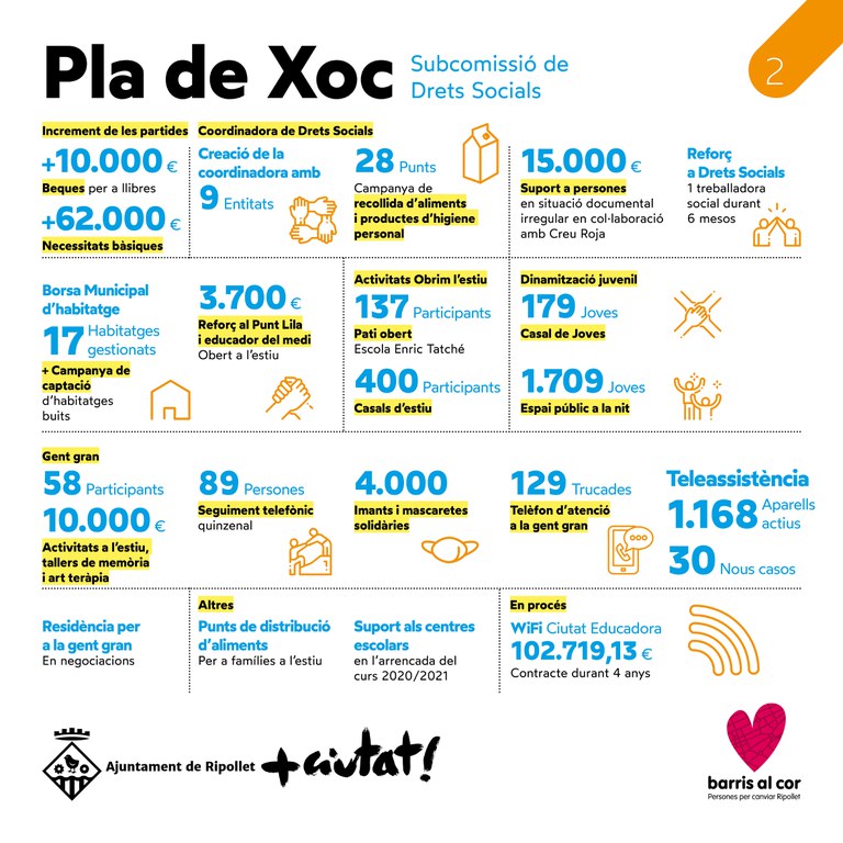 Per poder implementar el Pla de Xoc, es va haver d'aprovar una modificació de crèdits per valor de 300.000 euros, 100.000 € per cada subcomissió. Entre les mesures més urgents, hi era la de fer front a les necessitats bàsiques de la ciutadania, motiu pel qual Drets Socials va ampliar aquesta partida en 62.000 euros, així com la de beques, en més de 10.000 €. En el si d'aquesta subcomissió, també es va acordar el naixement de la Coordinadora Ciutadana de Drets Socials, que recentment ha endegat una campanya permanent de recollida d'aliments, per tal de donar suport a les entitats socials locals. L'atenció a la gent gran també ha estat una prioritat en aquesta taula sectorial, mantenint el servei i oferint una comunicació constant a unes 4.000 persones grans del municipi, així com organitzant activitats entre els mesos de juliol a octubre. L'atenció a les persones joves i el suport als centres educatius han estat altres línies de treball del Pla.