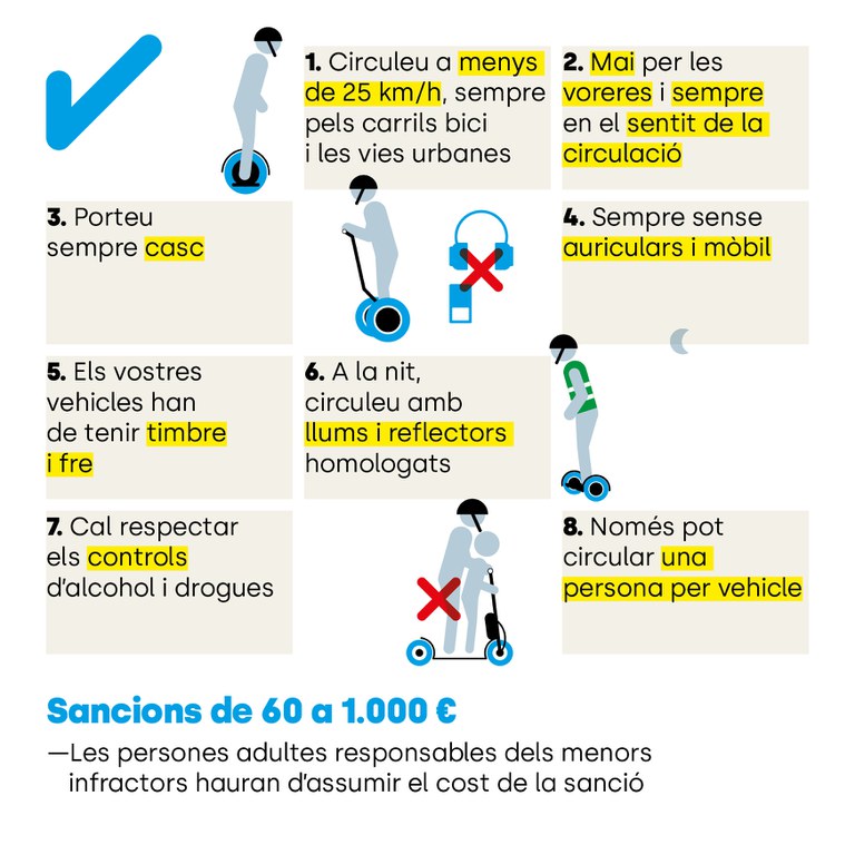 Segons fonts de la Policia Local, les normes que s'incompleixen més freqüentment, i que a partir d'ara es podran sancionar, són no portar casc i circular més d'una persona i per les voreres. També es recorda que l'edat mínima per utilitzar-los és, actualment, els 16 anys, i que la velocitat màxima és de 25 Km/h. L'ordenança estableix sancions de 60 a 1.000 €, segons les infraccions. En els cas dels menors infractors, les persones adultes responsables hauran d'assumir el cost de la sanció.
