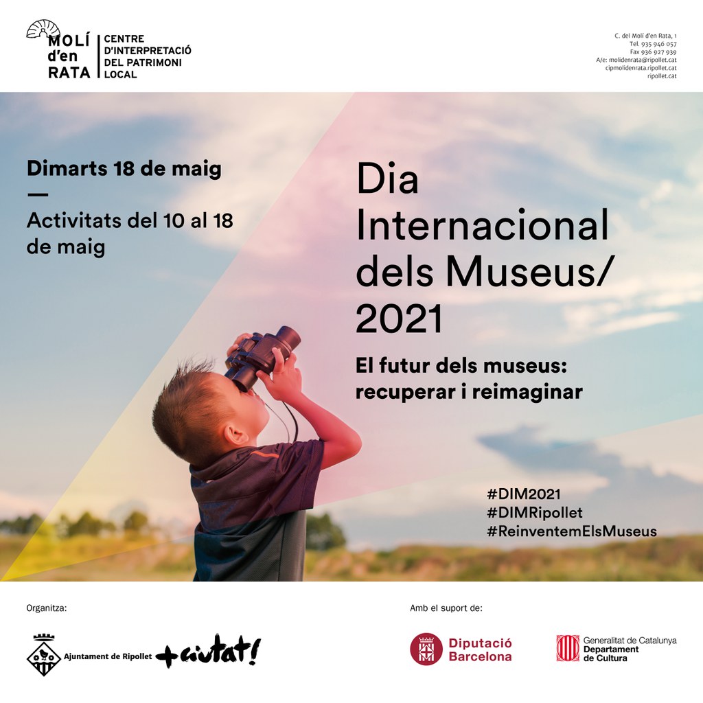Un any més el CIP Molí d'en Rata se suma a la celebració del Dia Internacional dels Museus, impulsat per l'ICOM (Consell Internacional dels Museus) des de 1977. Enguany, encara amb pandèmia però amb possibilitat d'activitats presencials, el lema proposat per l'ICOM és "El futur dels museus: recuperar i reimaginar" i cada museu organitzarà activitats i jornades en funció de les seves disponibilitats i possibilitats que ofereixi el context sanitari del moment.