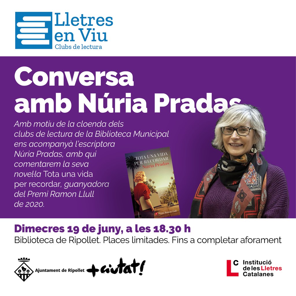 El pròxim dimecres 19 de juny, a les 18.30 h, l’escriptora barcelonina Núria Pradas visitarà la Biblioteca de Ripollet per celebrar la cloenda dels clubs de lectura i comentar la seva obra Tota una vida per recordar, guanyadora del Premi Ramon Llull. Aquesta activitat s’organitza gràcies al suport del programa 'Lletres en Viu' impulsat per la Institució de les Lletres Catalanes que afavoreix el contacte entre els lectors i lectores i els autors i autores de literatura catalana mitjançant la seva presència en les trobades als clubs de lectura d'adults que s’organitzen a les biblioteques públiques del país.