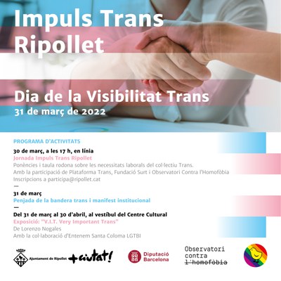 El 31 de març es commemora el Dia Internacional per la visibilitat Trans. Una jornada de celebració i sensibilització contra la discriminació cap a les persones trans. A Ripollet, enguany, es vol fixar la mirada en aquelles dificultats que el col·lectiu troba especialment en el món laboral. Després que l’Ajuntament posés en marxa el 2019 el Dispositiu de Mercat de Treball LGTBI, amb el suport de la Diputació de Barcelona, el consistori vol aprofitar aquest dia per seguir avançant en aquest sentit. Així, dimecres 30 de març, s’ha organitzat la jornada en línia Impuls Trans Ripollet, amb la participació de la Federació Plataforma Trans, la Fundació Surt i l’Observatori Contra l’Homofòbia.