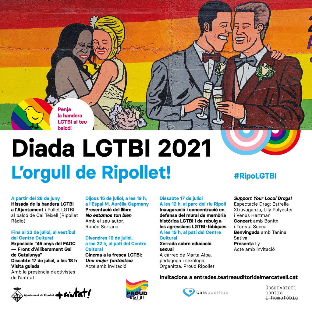 Ripollet celebra enguany la Diada LGTBI, tancant com fa habitualment els actes de l’Orgull a la comarca. Des del passat 28 de juny, Dia Internacional de L'orgull LGTBI, ja oneja a l’Ajuntament la bandera de l’arc de Sant Martí i a Cal Teixell (Ripollet Ràdio) la del Pollet LGTBI, ara amb un crespó negre, després de les darreres agressions LGTBI-fòbiques, entre elles el crim de A Corunya. Aquests fets, que se sumen a les prop d’un centenar d’agressions registrades a Catalunya en el que portem de 2021, han provocat que la Diada LGTBI prengui un caire més reivindicatiu, amb el suport d’entitats com Proud Ripollet, l’Observatori Contra l’Homofòbia i Gais Positius.