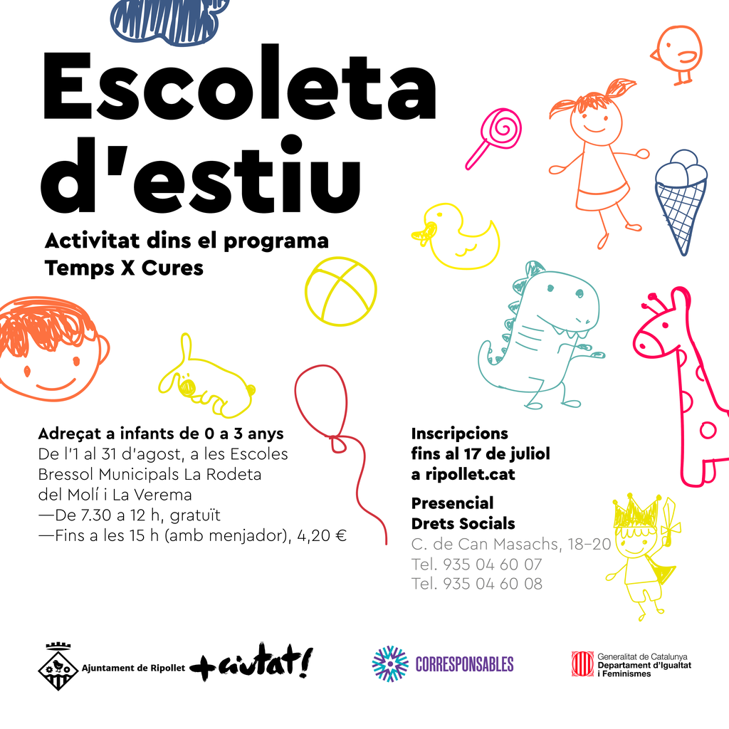 L'Ajuntament de Ripollet oferirà de l'1 al 31 d'agost el servei de l'Escoleta d'estiu ‘Temps per cures’ a les instal·lacions de les escoles bressol municipals La Rodeta del Molí i La Verema. Es tracta d'oferir a les famílies un servei gratuït de cura als infants de 0 a 3 anys fora de l'horari lectiu. El servei és gratuït de 7.30 a 12 h, però també s'ofereix la possibilitat d'allargar-lo fins a les 15 h, si s'inclou el servei del menjador, que té un cost de 4,20 euros per dia. Es tracta de tenir cura de les persones cuidadores, més enllà de la conciliació laboral, i les permet deixar els infants en aquest espai educatiu per tenir temps per a fer allò que estimin necessari i així tenir cura de si mateixes. La inscripció es pot realitzar, per setmanes, fins al pròxim 17 de juliol, a ripollet.cat o a les oficines de Drets Socials, de dilluns a divendres, de 9 a 14 h.