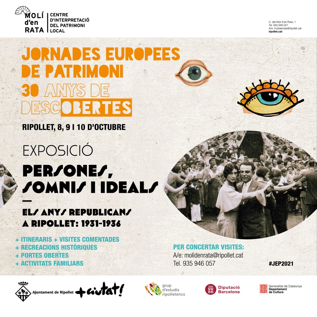 El CIP Molí d’en Rata, que hi participa des de 2007, s’hi suma enguany posant com a eix central una nova exposició, que s’instal·larà a la sala d’exposicions temporals i que commemora els 90 anys de la República. Amb el títol “Persones, somnis i ideals. Els anys republicans a Ripollet: 1931-1936”, aquesta mostra és fruit de la col·laboració entre el Centre d’Interpretació del Patrimoni, l’Arxiu municipal i el Grup d’Estudis Ripolletencs, que han fet la recerca i la redacció dels textos.