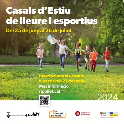 Els infants i joves de Ripollet podran gaudir enguany d'una variada oferta de Casals d'Estiu, amb un total de 16 propostes organitzades per entitats de lleure, esportives i de famílies que formen part de la Comissió de casals d'estiu, juntament amb l'Escola Esportiva Municipal. Els casals, que compten amb el suport del Pla Educatiu d'Entorn, tindran lloc del 25 de juny al 26 de juliol, a diferents espais municipals i ofereixen prop de 2.100 places per a infants i joves de Ripollet. El període d'inscripció s'obrirà el pròxim dimarts, 21 de maig, de forma presencial o en línia, en funció de cada casal. En aquest enllaç es pot consultar tota l'oferta de casals i la informació necessària sobre la inscripció.