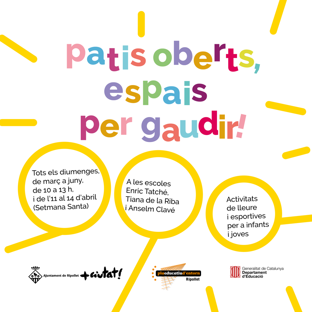 A partir de diumenge, 6 de març, s’obriran els patis de les escoles Tiana, Tatché i Clavé, de 10 a 13 hores. Tots els diumenges fins a finals del curs escolar i els dies de vacances escolars 11, 12, 13 i 14 d’abril, els infants i les seves famílies podran gaudir d’aquests espais amb activitats dinamitzades per una parella educadora. Les activitats son d'educació en el lleure i esportives per a infants i adolescents, com ara tallers educatius, per a la promoció del coneixement del medi, lingüístic, matemàtic i físic, jocs tradicionals i de cucanya, i activitats esportives, amb jocs diversos no competitius i heterogenis des de la perspectiva de gènere, entre altres.