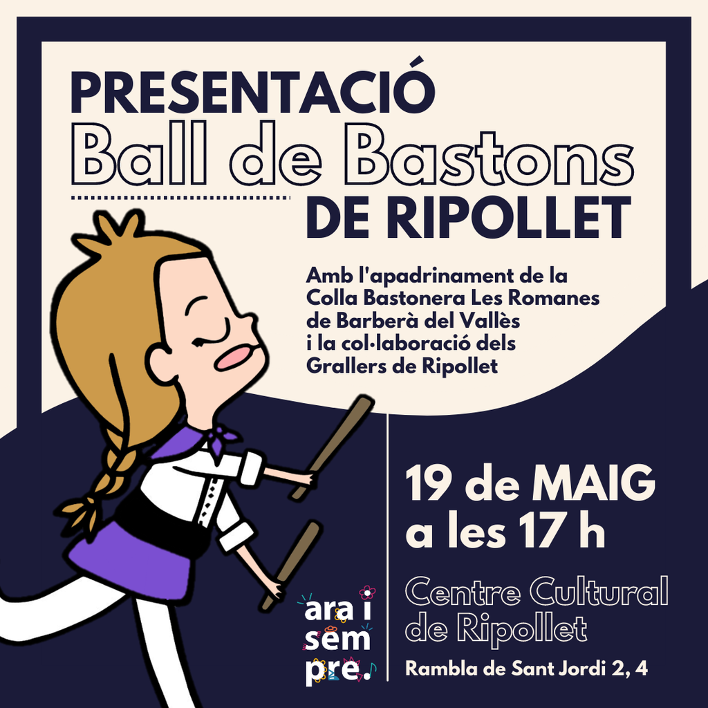 A l’acte, que comptarà amb la participació dels gralles dels Gegants de Ripollet, es presentaran les dues primeres peces de ball de bastons creades a Ripollet, amb músiques de la Coordinadora de Ball de bastons de Catalunya, present a l’acte a través de la seva delegada al Vallès, Marta Rodríguez. La coordinadora també els ha cedit el vestuari que lluiran dijous. El grup també ballarà altres peces cedides per la colla Les Romanes, qui l’ha convidat el pròxim diumenge a participar a La Bastonada del Vallès 2022, que tindrà lloc a Barberà del Vallès, amb la participació de 12 colles d’arreu de Catalunya, el que suposarà la seva presentació fora de Ripollet.