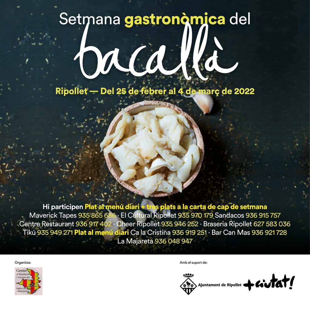 Del 25 de febrer al 4 de març, una desena de restaurants de Ripollet oferiran plats i menús amb una de les especialitats típiques de Quaresma, el bacallà, com a protagonista estrella. Després de la bona acollida, el 2021, de la Ruta Gastronòmica de Sant Jordi i de la Setmana del Bolet a Ripollet, alguns restaurants locals s’han sumat a la iniciativa del Gremi d’Hostaleria i Turisme del Vallès Occidental i Barcelonès d’oferir plats a la carta el cap de setmana i menús diaris amb el bacallà com a ingredient principal.
