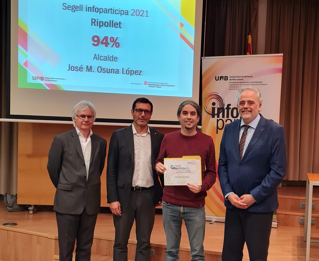 L'alcalde de Ripollet, Jose M. Osuna, va assistir ahir dilluns, acompanyat del regidor de Comunicació, Oriol Mor, i de la regidora de Modernització Administrativa, Andrea Guijarro, a l'acte de lliurament dels guardons del Segell Infoparticipa 2021, que l'Ajuntament ha obtingut per primera vegada. Osuna s'ha mostrat molt satisfet per aquest reconeixement, que atorga el grup de recerca Comunicació Sonora, Estratègica i Transparència (ComSET) de la UAB, que és qui elabora els informes d'avaluació i el Mapa Infoparticipa. Així, content per la feina feta, l'alcalde manté l'objectiu d'aconseguir el 100%, tal com va assegurar en roda de premsa.