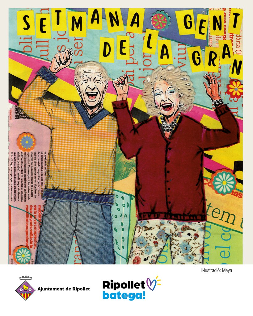 Del 30 de setembre al 3 d’octubre, Ripollet acull la cinquena Setmana de la Gent Gran, organitzada per l'Ajuntament, en col·laboració amb un bon nombre d’entitats del sector i també culturals. Una cita que coincideix amb el Dia Internacional de les Persones Grans, l'1 d’octubre, i que reconeix la vellesa com una etapa activa, plena d’oportunitats i de drets. El cartell, signat amb el pseudònim Maya, transmet vitalitat i una mirada positiva cap a l’envelliment.