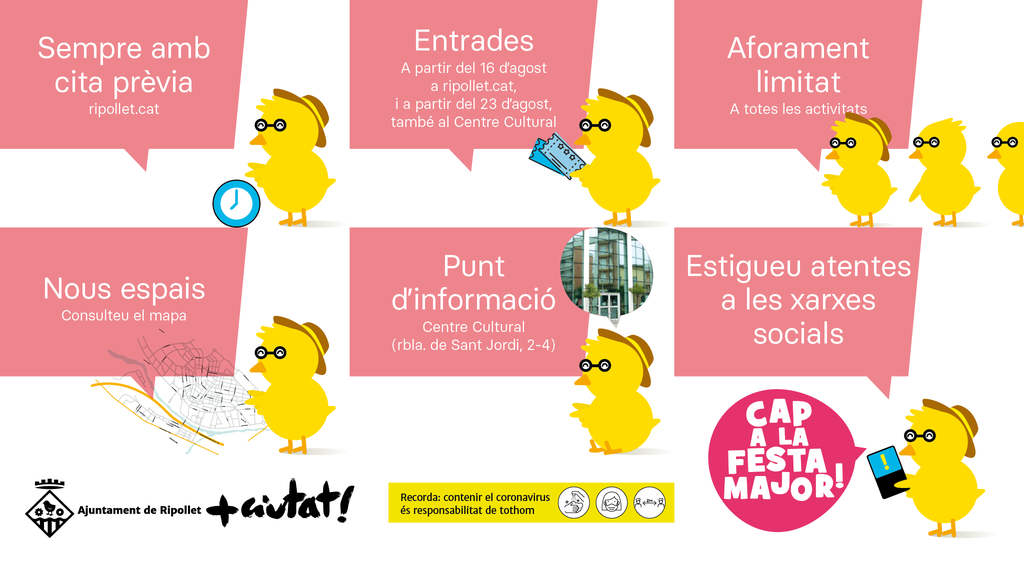 En cas que hi hagin novetats o canvis en les restriccions i/o horaris, la setmana de Festa Major l’Ajuntament donarà tota la informació oportuna i actualitzada a través de ripollet.cat i les xarxes socials municipals.