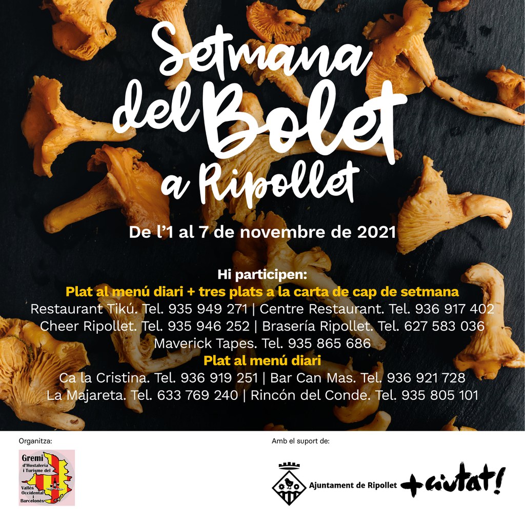 Després de la bona acollida de la Ruta Gastronòmica de Sant Jordi a Ripollet, alguns restaurants locals s’han sumat a la iniciativa del Gremi d’Hostaleria del Vallès Occidental d’oferir plats i menús amb un dels més preuats ingredients de la tardor, els bolets. La Setmana del bolet a Ripollet compta amb el suport de l’Ajuntament de Ripollet, que convida a la ciutadania a visitar els restaurants de la ciutat i gaudir de la cuina de temporada amb productes de proximitat.