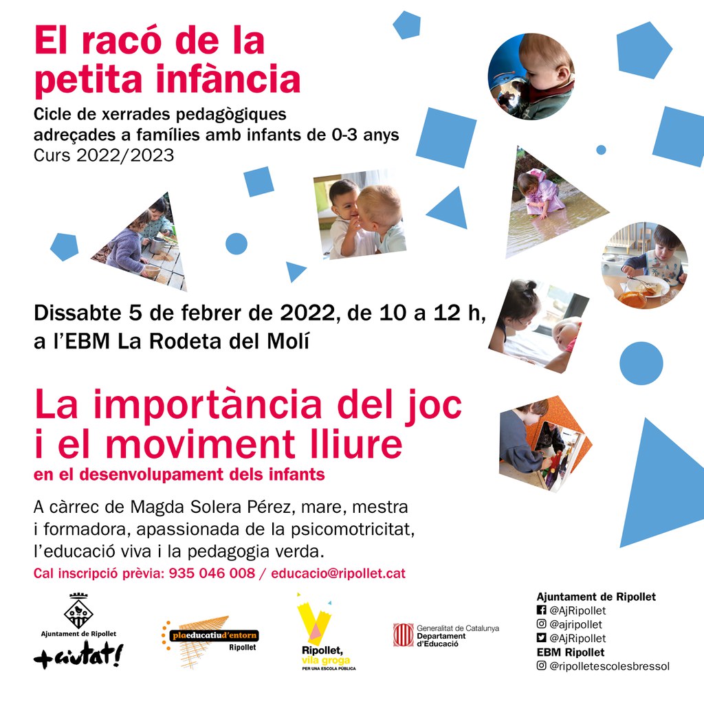 ‘La importància del joc i el moviment lliure en el desenvolupament dels infants de 0 a 3 anys’ és el títol de la primera xerrada del Racó de la petita infància, que s’engegarà el pròxim dissabte, 5 de febrer, a càrrec de Magda Solera Pérez, mare, mestra i formadora. Solera ens parlarà de les seves passions que són la psicomotricitat, l’educació viva i la pedagogia verda, centrada en infants de 0 a 3 anys. La xerrada tindrà lloc a l’EBP La Rodeta del Molí, de 10 a 12 h i les famílies poden venir acompanyades amb els infants. L’aforament, donada la situació sanitària, serà limitat i cal inscripció prèvia a educacio@ripollet.cat o al 935 046 008. L’objectiu d’aquest espai és oferir un seguit de propostes adaptades a les necessitats dels infants de 0 a 3 anys, per treballar i gaudir amb les persones més petites de la casa.