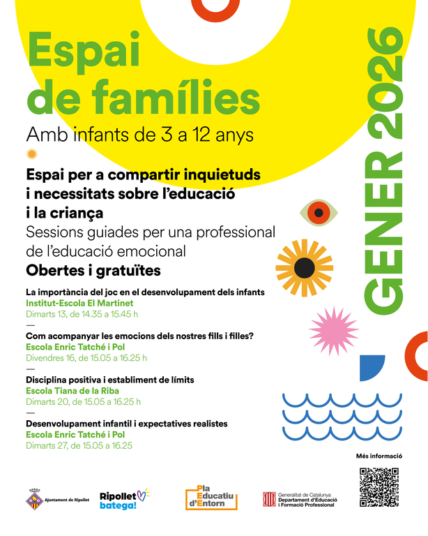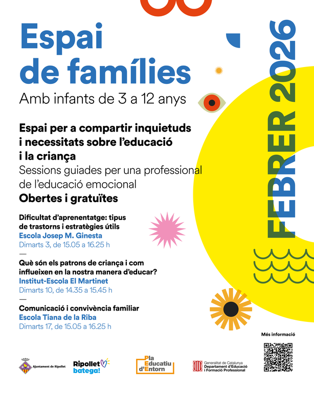 Espais de trobada per a les famílies de Ripollet amb infants i joves de 3 a 12 anys, on podran compartir inquietuds i necessitats al voltant de l’educació i la criança dels seus fills i filles. Les sessions estaran guiades per una professional de l’educació emocional.