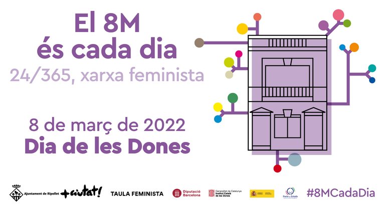 El 8M, Ripollet vol seguir fomentant l’empoderament femení i la sororitat entre les dones, contra la societat patriarcal que encara perdura, a més d’enfortir una xarxa lila, des de baix, implicant centres educatius, entitats, agents socials i persones a títol individual que no només es posin les ulleres liles el 8M, sinó els 365 dies de l’any. “La visió de gènere ha d’estar present a totes les polítiques municipals i el nostre objectiu és que cada mes de l’any pugui desenvolupar-se alguna activitat a Ripollet que ens recordi que aquesta lluita no és qüestió d’un dia”, explica la regidora de Feminismes, Txell Caler.